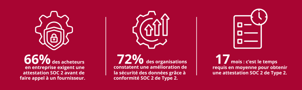Le cadre de conformité SOC 2 (System and Organization Controls 2) a été créé pour palier à l’absence de méthode normalisée d’évaluation des contrôles internes et des processus organisationnels, notamment en matière de sécurité de l’information et de systèmes informatiques. Aujourd’hui, ce cadre aide les acheteurs en entreprise à prendre des décisions cruciales quant au choix des fournisseurs de services. D’ailleurs, environ 66 % des acheteurs exigent la conformité SOC 2 de type 2 quand il est question d’IA et de logiciels-services.
